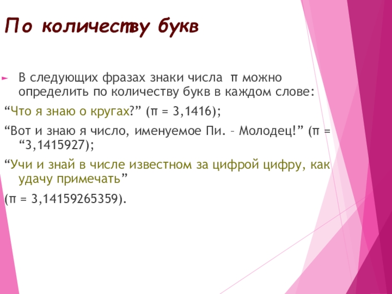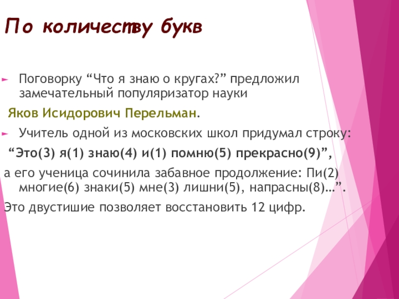 а его ученица сочинила забавное продолжение: Пи(2) многие(6) знаки(5) мне(3) лишни(5), напрасны(8)…”.