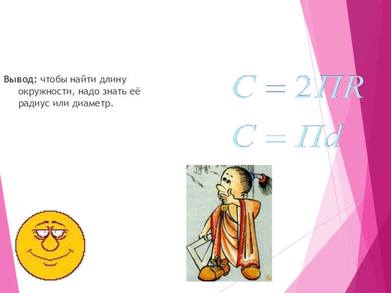 Слайд 38Вывод: чтобы найти длину окружности, надо знать её радиус или диаметр.