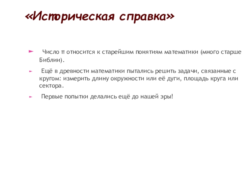 Ещё в древности математики пытались решить задачи, связанные с кругом: измерить длину окружности или её дуги, площадь круга или сектора.