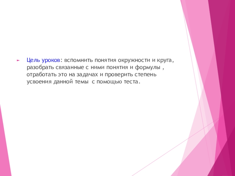 Слайд 2Цель уроков: вспомнить понятия окружности и круга, разобрать связанные с ними