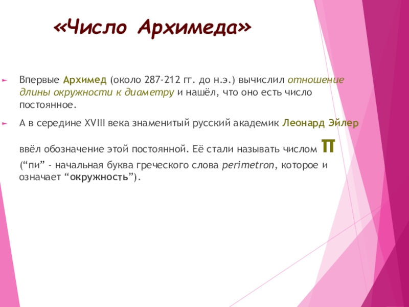 А в середине XVIII века знаменитый русский академик Леонард Эйлер ввёл обозначение этой постоянной. Её стали называть числом π (“пи” - начальная буква греческого слова perimetron, которое и означает “окружность”).