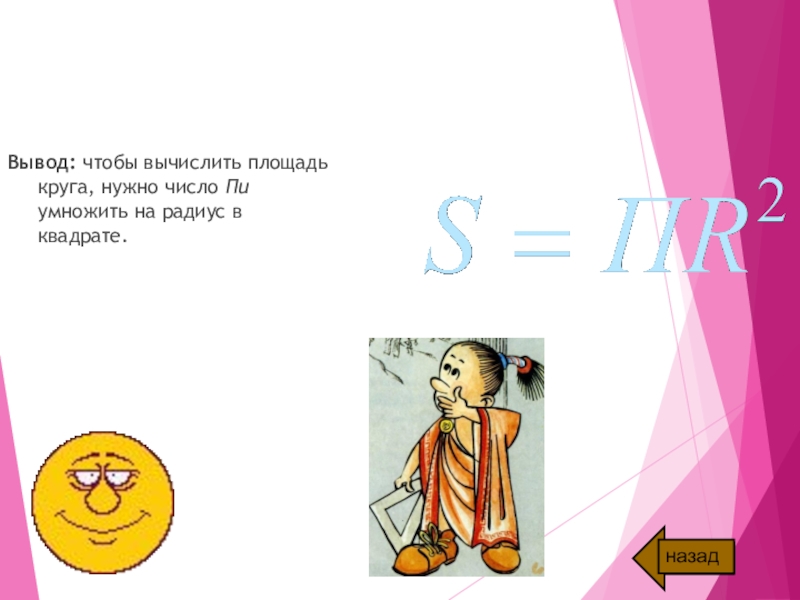Слайд 39Вывод: чтобы вычислить площадь круга, нужно число Пи умножить на радиус