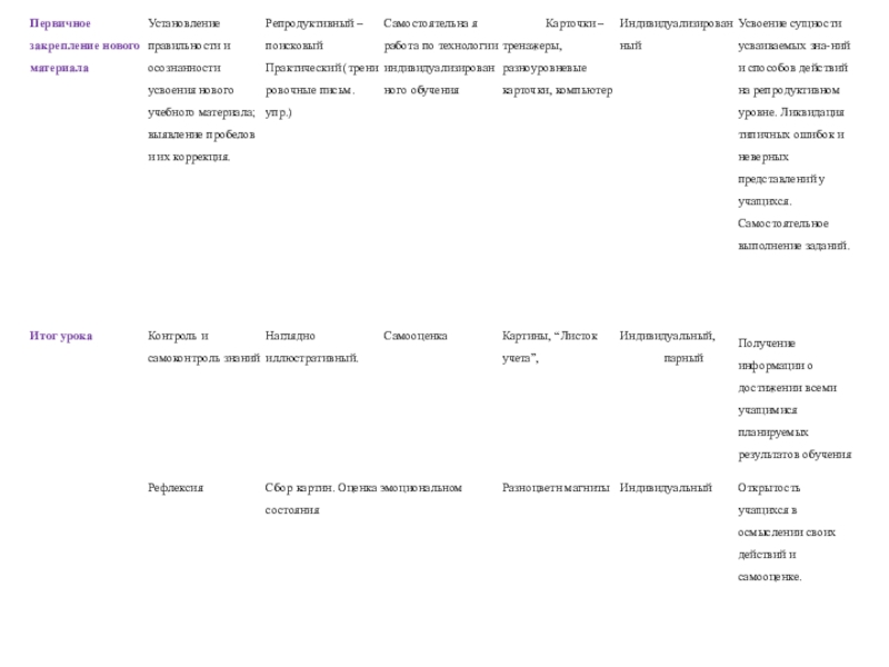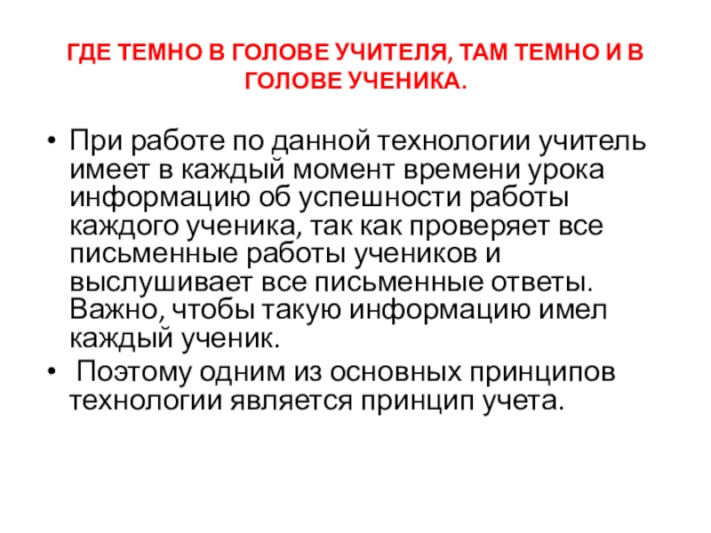 При работе по данной технологии учитель имеет в каждый момент времени урока информацию об успешности работы каждого ученика, так как проверяет все письменные работы учеников и выслушивает все письменные ответы. Важно, чтобы такую информацию имел каждый ученик.