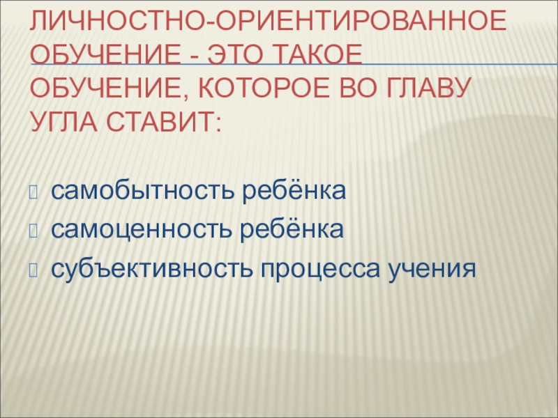 Слайд 4ЛИЧНОСТНО-ОРИЕНТИРОВАННОЕ ОБУЧЕНИЕ - ЭТО ТАКОЕ ОБУЧЕНИЕ, КОТОРОЕ ВО ГЛАВУ УГЛА СТАВИТ: