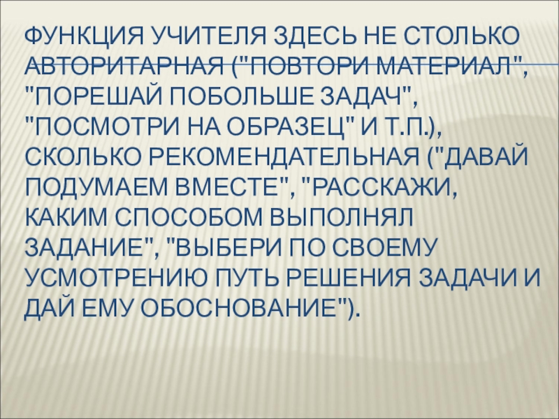 Слайд 16ФУНКЦИЯ УЧИТЕЛЯ ЗДЕСЬ НЕ СТОЛЬКО АВТОРИТАРНАЯ ("ПОВТОРИ МАТЕРИАЛ", "ПОРЕШАЙ ПОБОЛЬШЕ ЗАДАЧ",