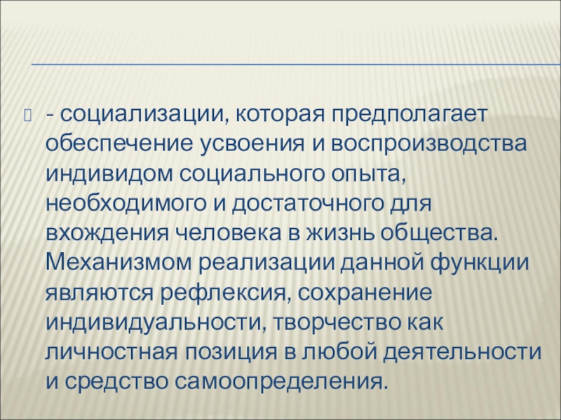 необходимого и достаточного для вхождения человека в жизнь общества. Механизмом реализации данной функции являются рефлексия, сохранение индивидуальности, творчество как личностная позиция в любой деятельности и средство самоопределения.