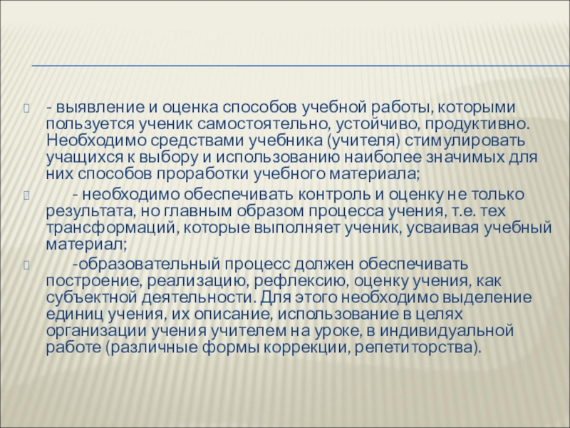 -образовательный процесс должен обеспечивать построение, реализацию, рефлексию, оценку учения, как субъектной деятельности. Для этого необходимо выделение единиц учения, их описание, использование в целях организации учения учителем на уроке, в индивидуальной работе (различные формы коррекции, репетиторства).