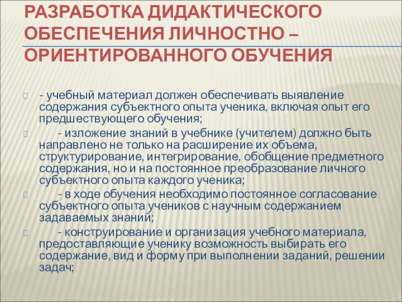 Слайд 12РАЗРАБОТКА ДИДАКТИЧЕСКОГО ОБЕСПЕЧЕНИЯ ЛИЧНОСТНО – ОРИЕНТИРОВАННОГО ОБУЧЕНИЯ