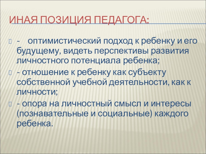 Слайд 10ИНАЯ ПОЗИЦИЯ ПЕДАГОГА: