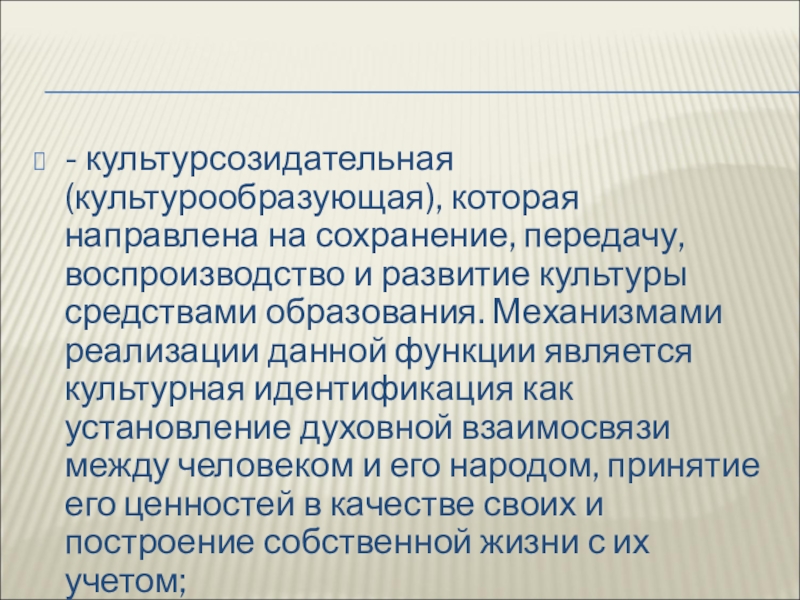 культуры средствами образования. Механизмами реализации данной функции является культурная идентификация как установление духовной взаимосвязи между человеком и его народом, принятие его ценностей в качестве своих и построение собственной жизни с их учетом;