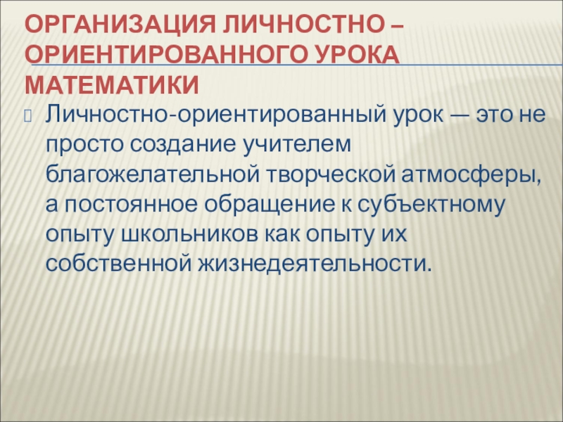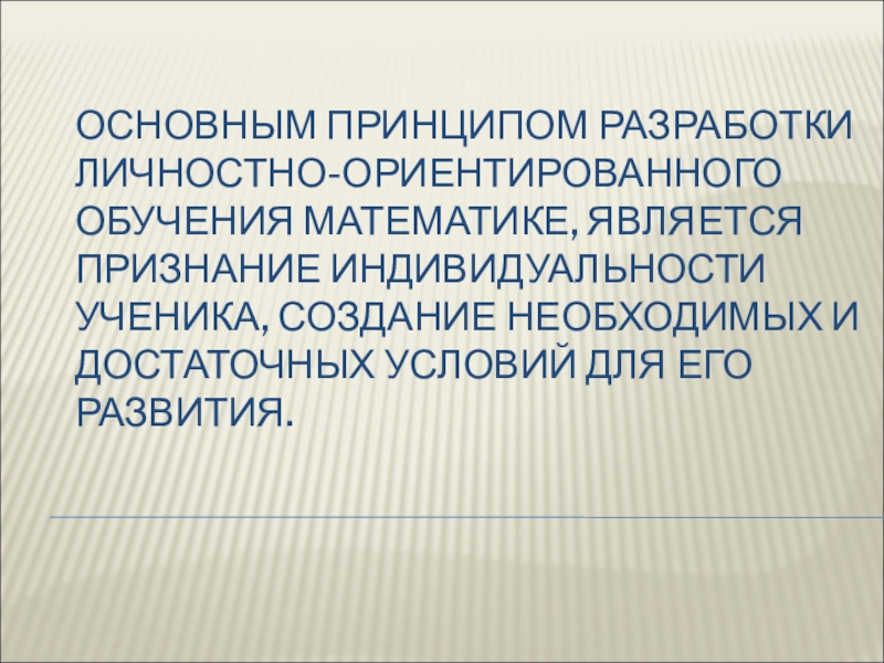 Слайд 11ОСНОВНЫМ ПРИНЦИПОМ РАЗРАБОТКИ ЛИЧНОСТНО-ОРИЕНТИРОВАННОГО ОБУЧЕНИЯ МАТЕМАТИКЕ, ЯВЛЯЕТСЯ ПРИЗНАНИЕ ИНДИВИДУАЛЬНОСТИ УЧЕНИКА, СОЗДАНИЕ