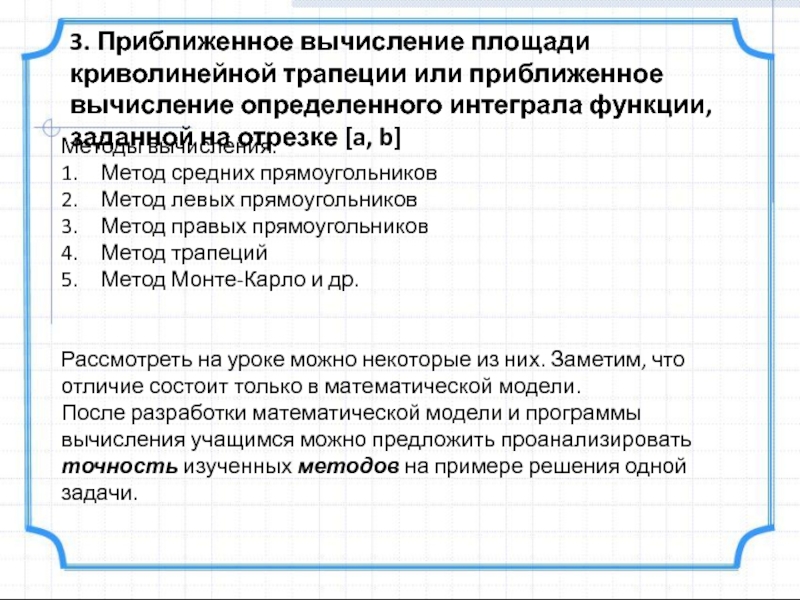 После разработки математической модели и программы вычисления учащимся можно предложить проанализировать точность изученных методов на примере решения одной задачи.
