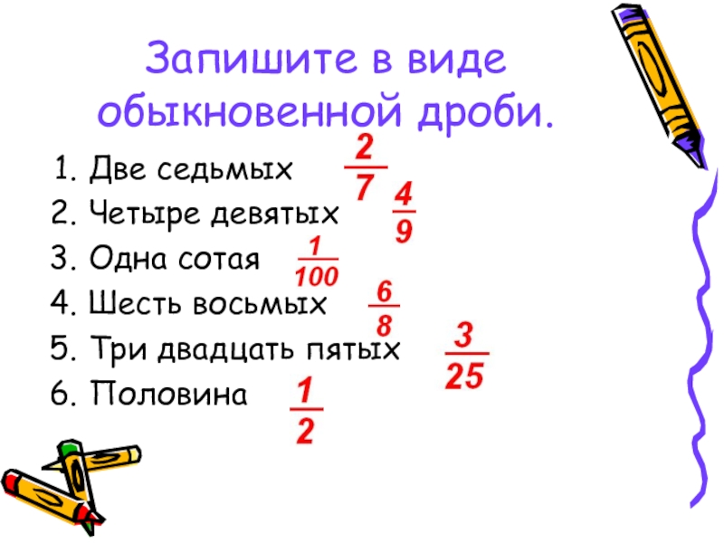 рода (одна, две, восемь и т.д.), а знаменатель – порядковое числительное (седьмая, сотая, двести тридцатая и т.д.)