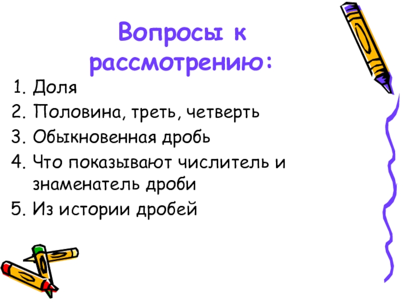 Познакомить с понятием доля, половина, треть, четверть, обыкновенная дробь,