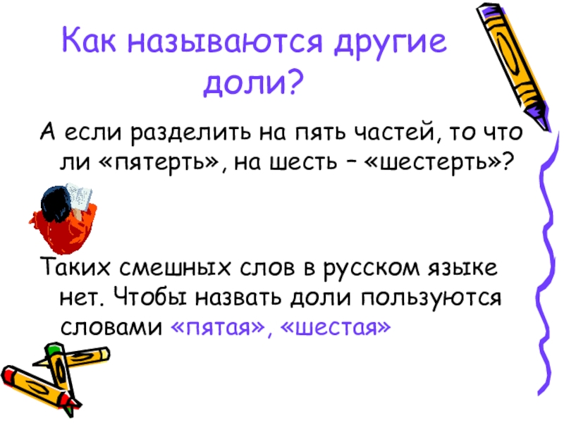 Таких смешных слов в русском языке нет. Чтобы назвать доли пользуются словами «пятая», «шестая»