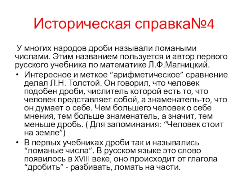 Историческая справка№4 У многих народов дроби называли ломаными числами. Этим названием пользуется и автор первого русского учебника