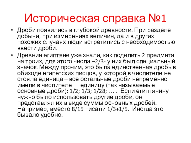 Историческая справка №1Дроби появились в глубокой древности. При разделе добычи, при измерениях величин, да и в других похожих случаях люди встретились с необходимостью ввести дроби.Древние египтяне уже знали, как поделить 2 предмета на троих, для этого