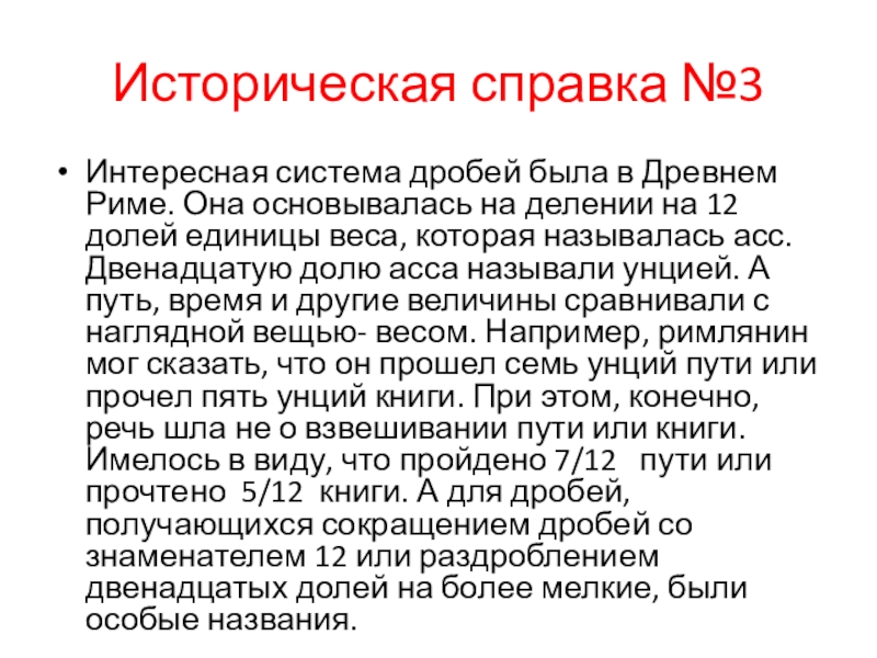 Историческая справка №3Интересная система дробей была в Древнем Риме. Она основывалась на делении на 12 долей единицы