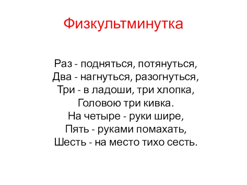 ФизкультминуткаРаз - подняться, потянуться, Два - нагнуться, разогнуться, Три - в ладоши, три хлопка, Головою три кивка.