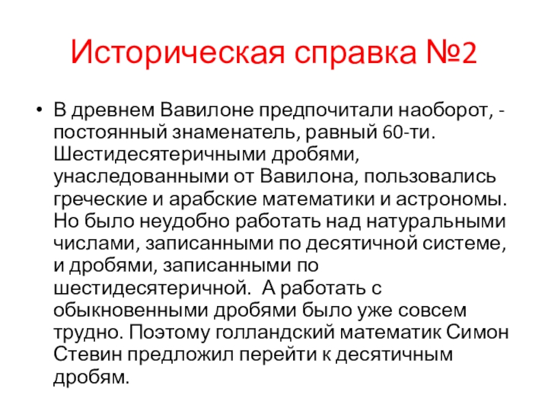 Историческая справка №2В древнем Вавилоне предпочитали наоборот, - постоянный знаменатель, равный 60-ти. Шестидесятеричными дробями, унаследованными от Вавилона,