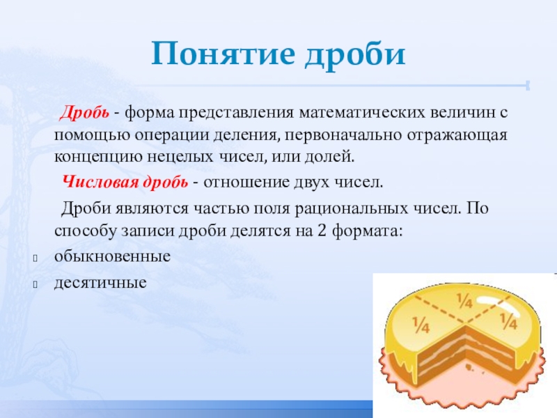 Дроби являются частью поля рациональных чисел. По способу записи дроби делятся на 2 формата: