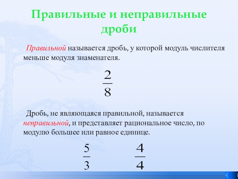 Дробь, не являющаяся правильной, называется неправильной, и представляет рациональное число, по модулю большее или равное единице.