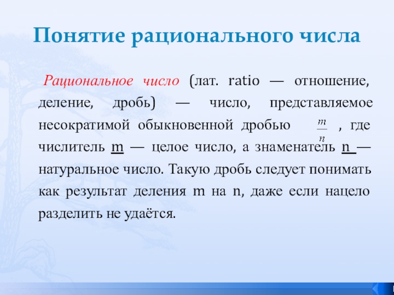 число, представляемое несократимой обыкновенной дробью , где числитель m — целое число, а знаменатель n — натуральное число. Такую дробь следует понимать как результат деления m на n, даже если нацело разделить не удаётся.