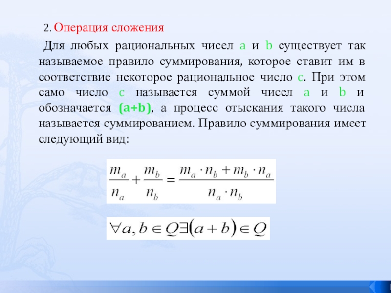 так называемое правило суммирования, которое ставит им в соответствие некоторое рациональное число c. При этом само число c называется суммой чисел a и b и обозначается (a+b), а процесс отыскания такого числа называется суммированием. Правило суммирования имеет следующий вид: