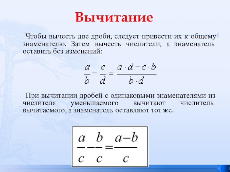 Чтобы вычесть две дроби, следует привести их к общему знаменателю. Затем