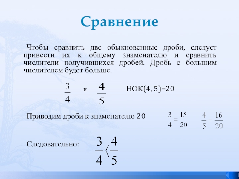 Чтобы сравнить две обыкновенные дроби, следует привести их к общему знаменателю