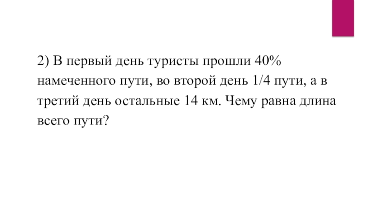 Слайд 102) В первый день туристы прошли 40% намеченного пути, во второй