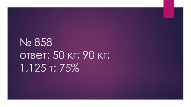 Слайд 14№ 858 ответ: 50 кг; 90 кг; 1,125 т; 75%