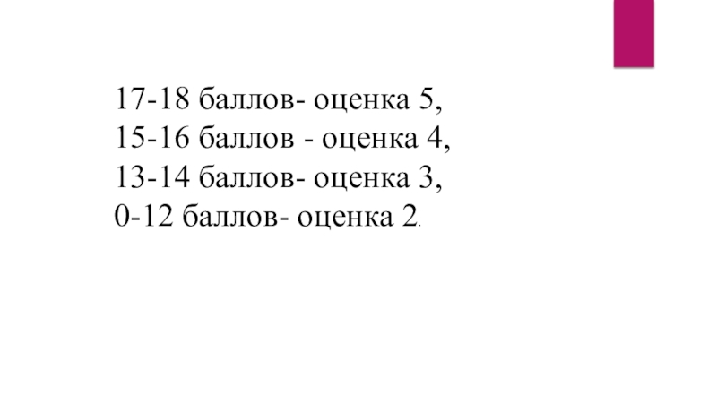 17-18 баллов- оценка 5, 15-16 баллов - оценка 4, 13-14 баллов- оценка 3, 0-12 баллов- оценка 2.
