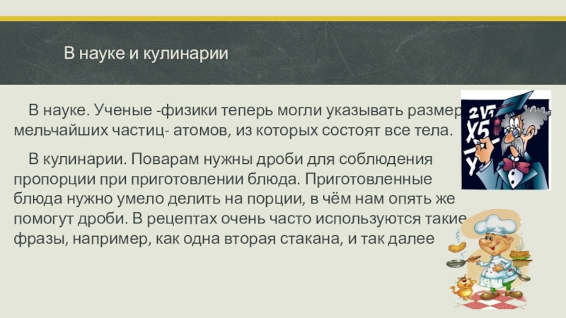 В науке и кулинарии   В науке. Ученые -физики теперь могли указывать размеры мельчайших частиц- атомов,