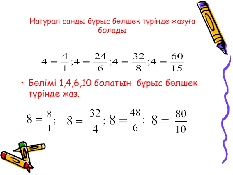 Слайд 10Натурал санды бұрыс бөлшек түрінде жазуға болады