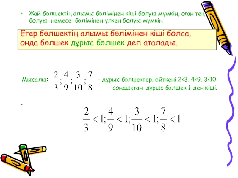 Слайд 4Жай бөлшектің алымы бөлімінен кіші болуы мүмкін, оған тең болуы немесе
