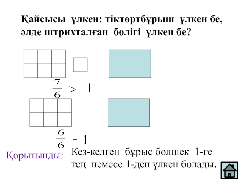Қайсысы үлкен: тіктөртбұрыш үлкен бе, әлде штрихталған бөлігі үлкен бе?1>Қорытынды:Кез-келген бұрыс бөлшек 1-ге тең немесе 1-ден үлкен