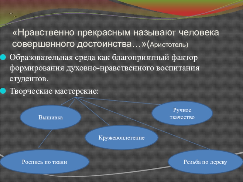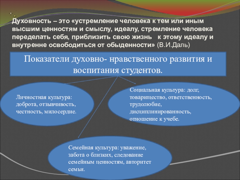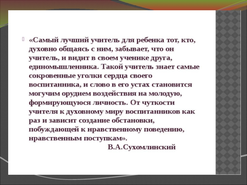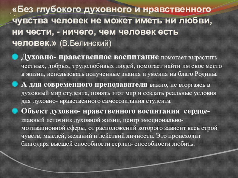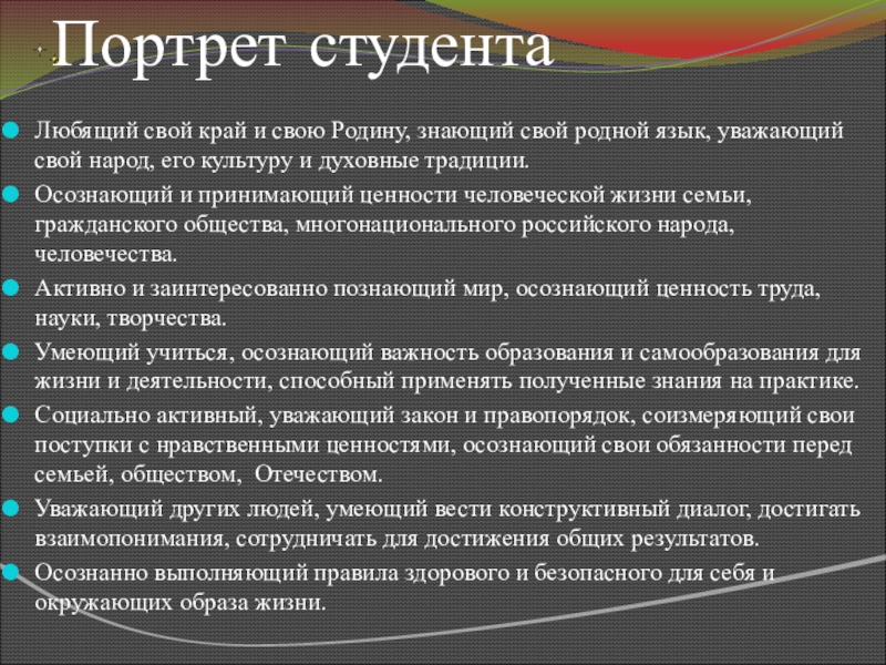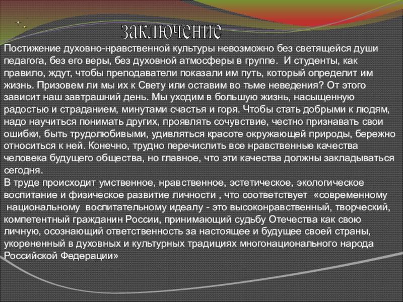 без духовной атмосферы в группе. И студенты, как правило, ждут, чтобы преподаватели показали им путь, который определит им жизнь. Призовем ли мы их к Свету или оставим во тьме неведения? От этого зависит наш завтрашний день. Мы уходим в большую жизнь, насыщенную радостью и страданием, минутами счастья и горя. Чтобы стать добрыми к людям, надо научиться понимать других, проявлять сочувствие, честно признавать свои ошибки, быть трудолюбивыми, удивляться красоте окружающей природы, бережно относиться к ней. Конечно, трудно перечислить все нравственные качества человека будущего общества, но главное, что эти качества должны закладываться сегодня.