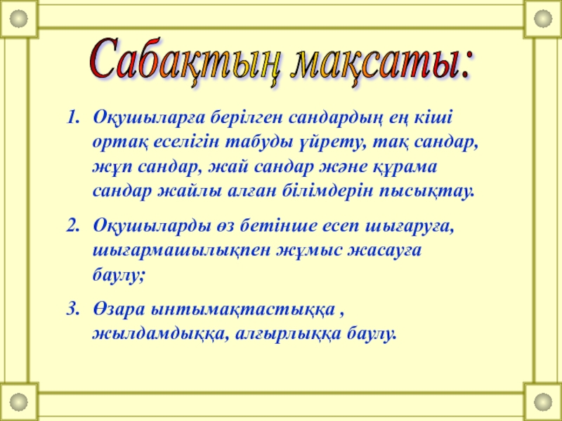 Оқушыларға берілген сандардың ең кіші ортақ еселігін табуды үйрету,