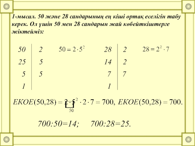 Слайд 121-мысал. 50 және 28 сандарының ең кіші ортақ еселігін табу керек.