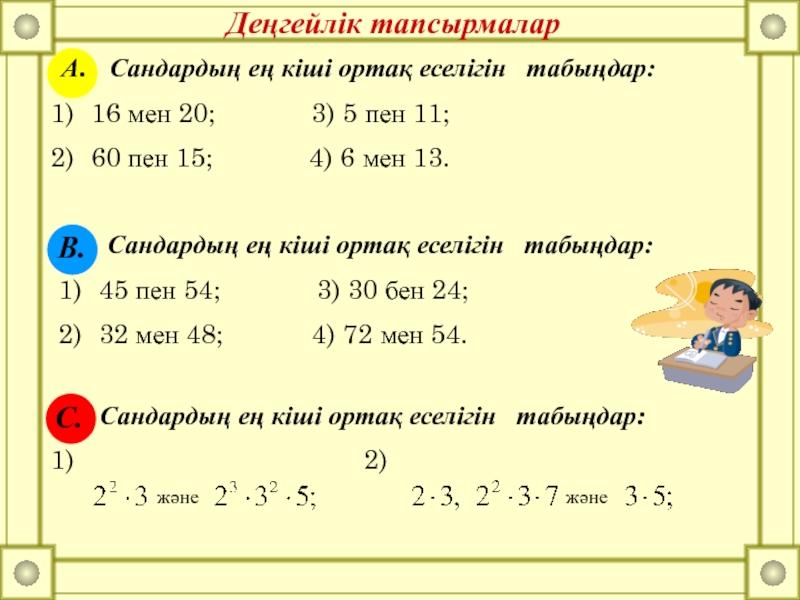 Деңгейлік тапсырмаларА.  Сандардың ең кіші ортақ еселігін  табыңдар:16 мен 20;