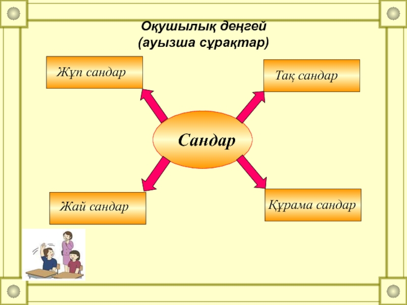 СандарЖұп сандарТақ сандарЖай сандарҚұрама сандарОқушылық деңгей (ауызша сұрақтар)