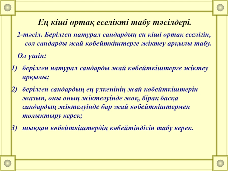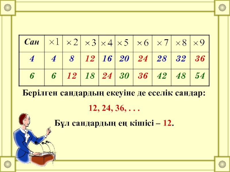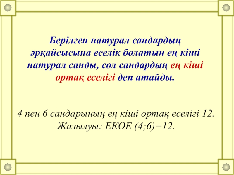 Слайд 10Берілген натурал сандардың әрқайсысына еселік болатын ең кіші натурал санды, сол