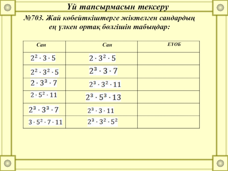 Үй тапсырмасын тексеру№703. Жай көбейткіштерге жіктелген сандардың ең үлкен ортақ бөлгішін табыңдар: