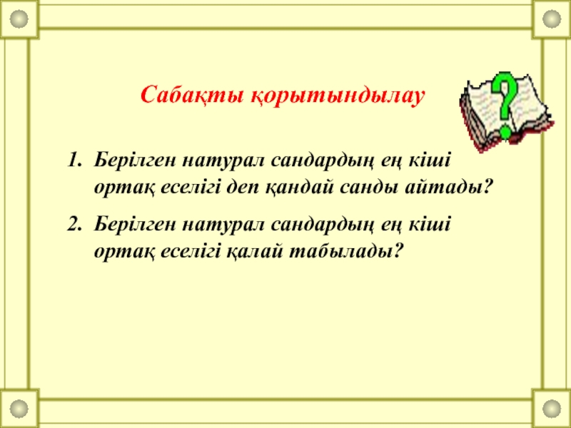 Сабақты қорытындылауБерілген натурал сандардың ең кіші ортақ еселігі деп қандай санды айтады?Берілген натурал сандардың ең кіші ортақ