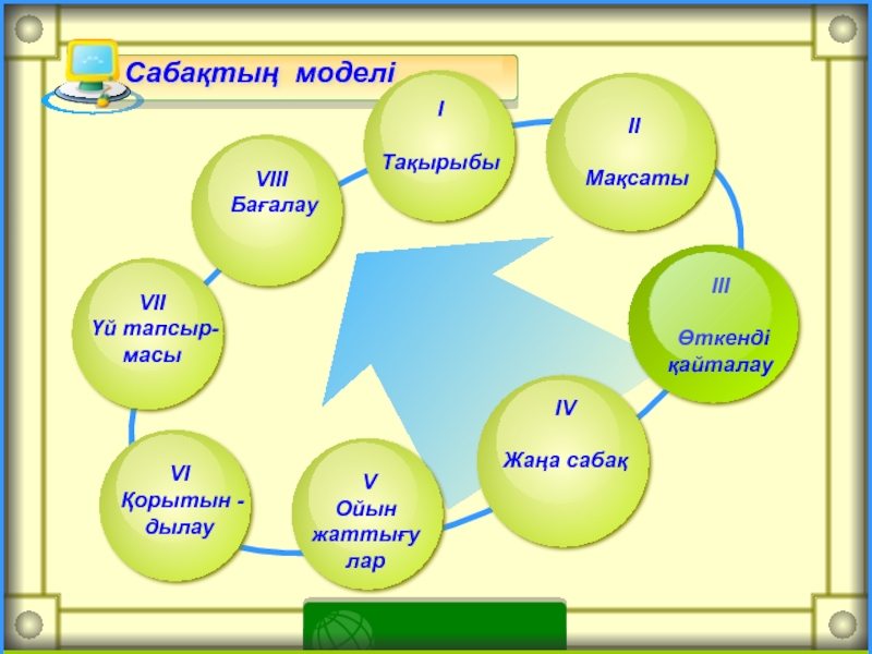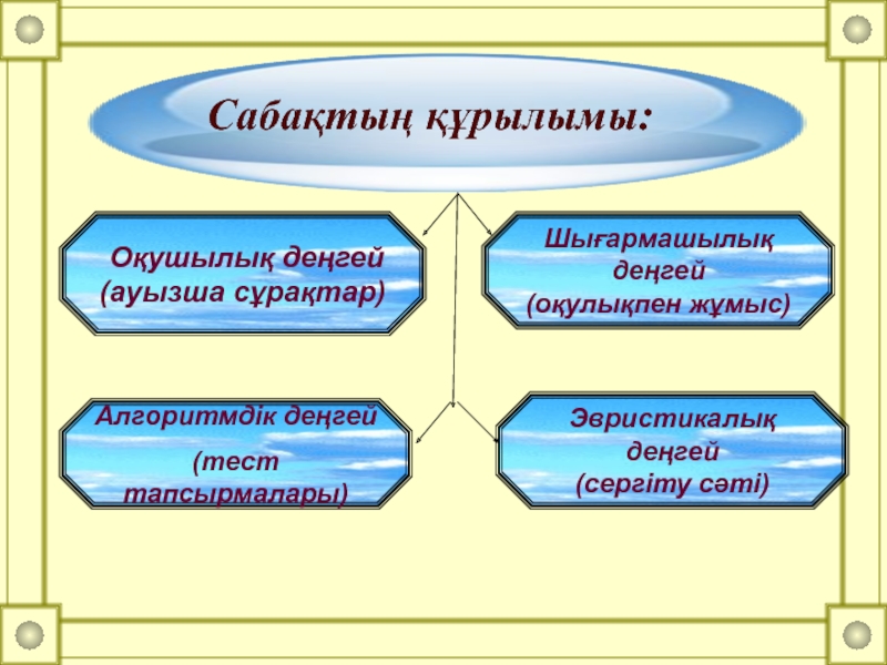 Сабақтың құрылымы: Оқушылық деңгей (ауызша сұрақтар)Шығармашылық деңгей (оқулықпен жұмыс)Алгоритмдік деңгей (тест тапсырмалары)Эвристикалық деңгей  (сергіту сәті)