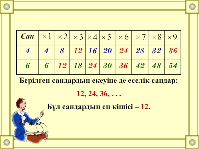 4 пен 6 сандарының ең кіші ортақ еселігі 12. Жазылуы: ЕКОЕ (4;6)=12.