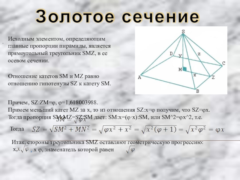Примем меньший катет MZ за х, то из отношения SZ:x=φ получим, что SZ=φx. Тогда пропорция SM:MZ=SZ:SM дает: SM:x=(φ·x):SM, или SM^2=φx^2, т.е.