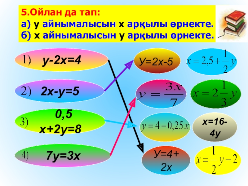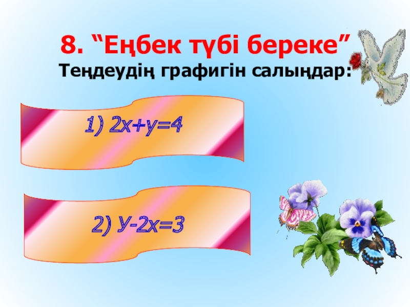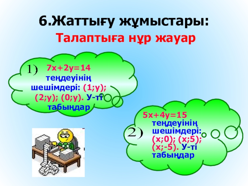 7х+2у=14 теңдеуінің шешімдері: (1;у); (2;у); (0;у). У-ті табыңдар