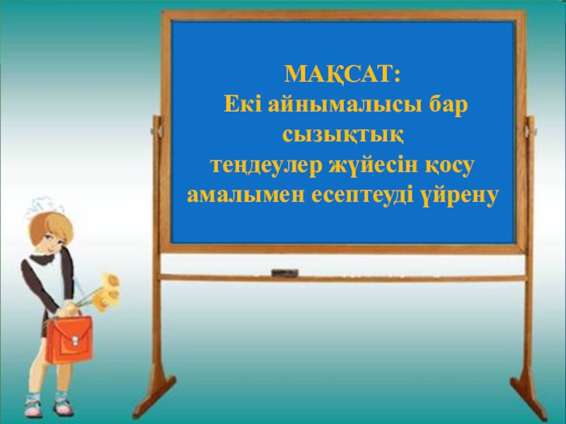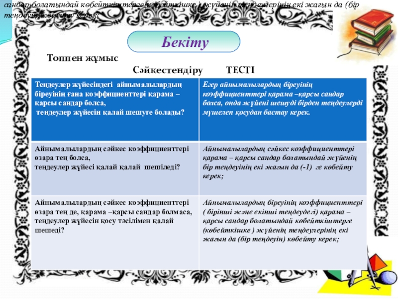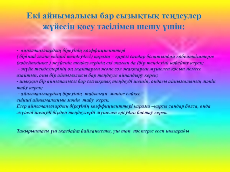 Айнымалылардың біреуінің коэффициенттері ( бірінші және екінші теңдеудегі) қарама – қарсы сандар болатындай көбейткіштерге(көбейткішке ) жүйенің теңдеулерінің екі жағын да (бір теңдеуін) көбейту керек;